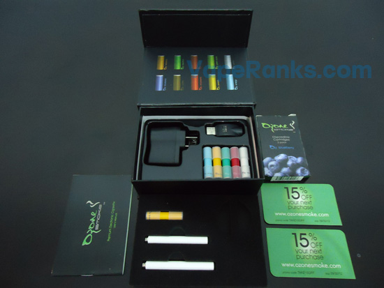 Like most other e-cigs, the Ozone Smoke comes in a magnet-top cardboard box. It includes all the essentials to get you vaping, but none of the accessories that make users’ experience easier and more pleasurable, like a portable charging case or a car charger. With the Deluxe kit you get one regular-size battery and one short, six “long lasting” cartomizers, a USB charger, a wall adapter and a user manual. Pretty basic stuff for $69.95, especially since we’re talking about a new brand, but let’s jump right to the nitty-gritty and see if performance can convince you to fork out that kind of money on an e-cig.